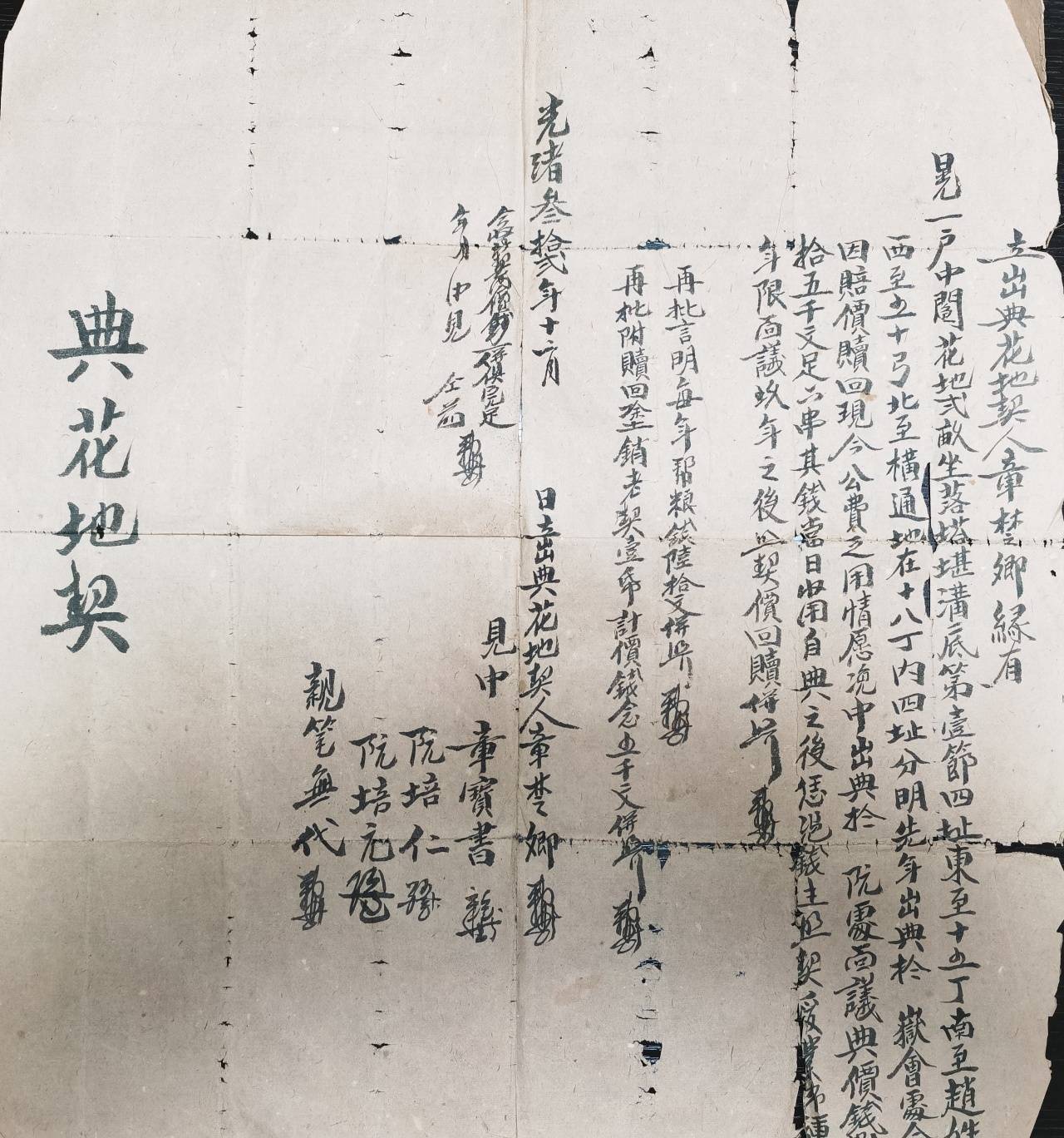典花地契立出典花地契人章椘卿缘由:晃一户中阄花地贰亩,坐落塔堪沟底第一节。四址:东至十五丁,南至赵姓户,西至五十弓,北至构通地,在十八丁内,四址分明。先年出典于岳会处,今因赔价赎回,现今公费乏用,情愿浼中出典于阮处。
